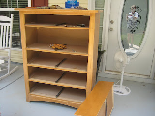 I cleaned the wood with Murphy's Oil Soap, sanded down all surfaces, gave it one coat of KILZ, one coat of gray paint (left over from my kitchen), two coats of Ebony Stain.....